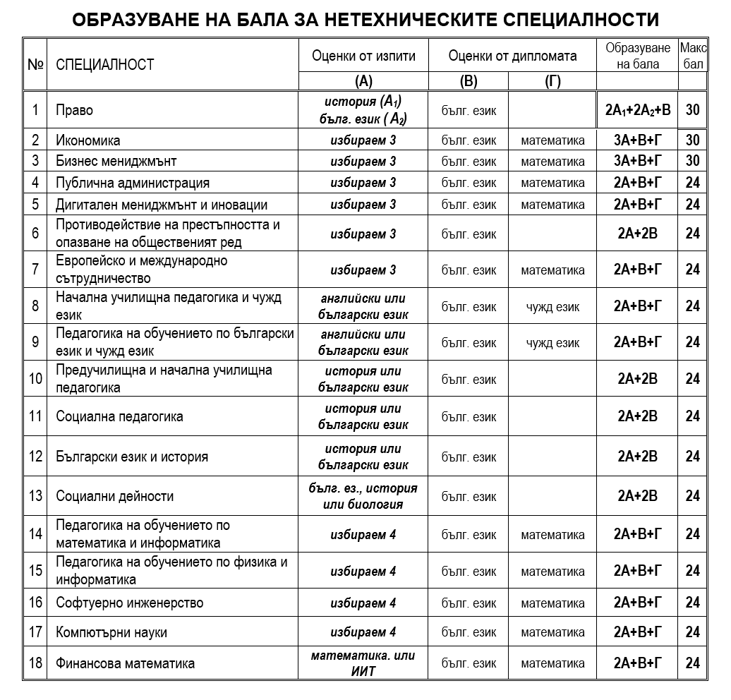 1. С "избираем 3" е означен кандидатстудентски изпит по: български език, чужд език (английски), история на България, икономическа география на България, информатика и информационни технологии, математика и общотехническа подготовка или съответната оценка от ДЗИ / ДИППК;